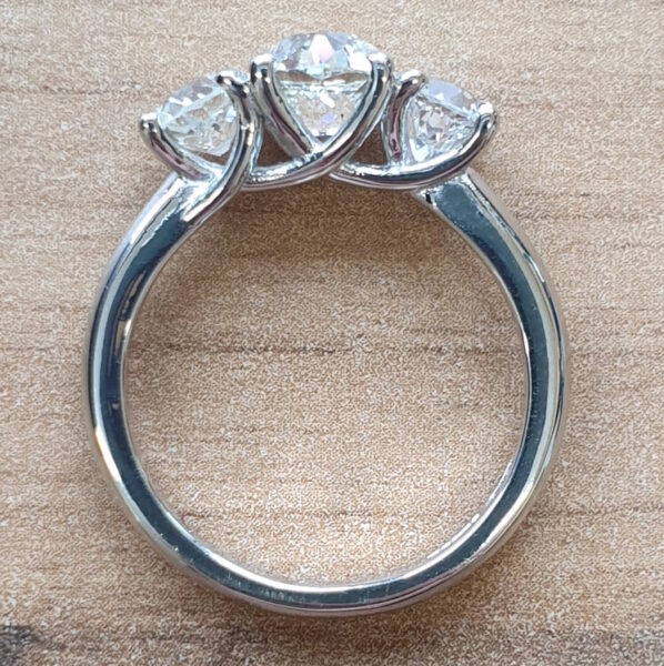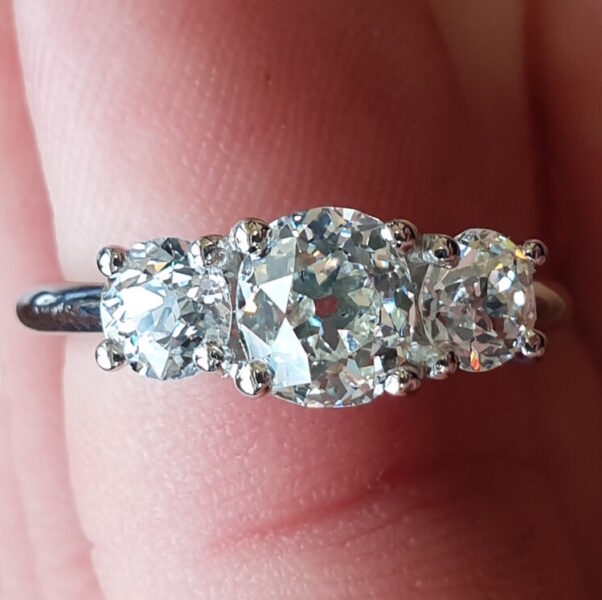 This is a piece of jewellery we have in stock which was inspired by a design we did for a client. Mary had inherited her Mothers jewellery and within the collection there were some fabulous old cut diamonds. Mary’s son, Paul was getting engaged and wanted to use the families stones to make the ring for his fiancé. We looked at the stone and showed Mary and Paul rings we had in stock as well as images he had looked at online. Paul decided to go with a ring that was a traditional 3 stone ring but if you looked at it from the side you could see the diamonds quite clearly and the design of the mount is modern. The mixed of old and new worked perfectly for Paul. We made a version of this ring for Paul and he was over the moon with it. We liked it so much that we made one as well!