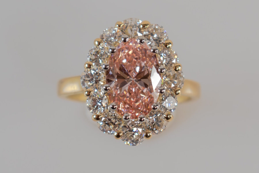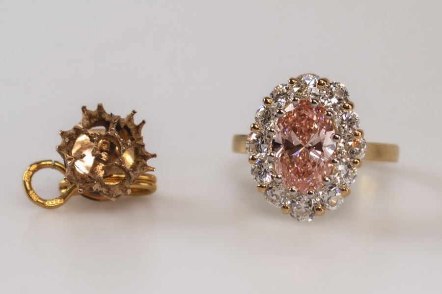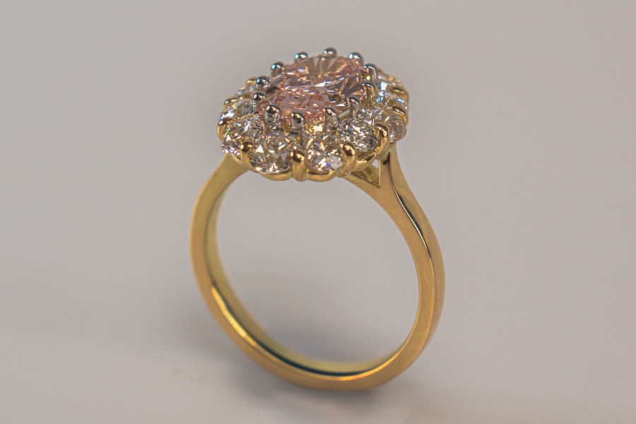Mary had been left a single earring by a family member. The earring had lovely bright well matched round diamonds. Mary was looking to repurpose it into an engagement ring. We were tasked with finding a synthetic diamond either pale blue or pink. We found some examples of available stones to show Mary. Mary choose the lovely pink stone you see in the ring. Mary wanted a ring similar in design to another family members ring. We adjusted the design to suit the oval centre stone. The pink stone has white claws, and the diamonds have yellow this was to enhance the colour of the pink stone. Now Mary has a fantastic oval synthetic pink diamond and natural diamond cluster ring to wear. This ring was very special as it utilized her family jewellery and gave a new lease of life with a modern new stone.