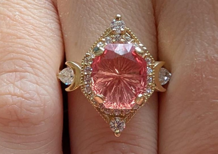 The brief was a large synthetic diamond which is would not be out of place on Marys hand. Mary has both yellow and white gold but felt the yellow gold shows of diamonds well. Mary did not want the ring to look like an engagement ring but liked the idea of a single diamond with other stones.