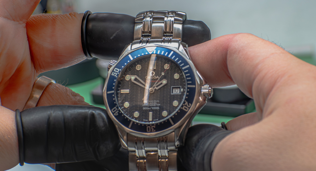 The watch is disassembled and the parts are checked for any deep scratches or dents. If there are large dents and scratches these can be rectified by the use of the laser welder, extra charge for this service and normally part of a full refurbishment. The parts are then sanded down using the correct tools for that job.